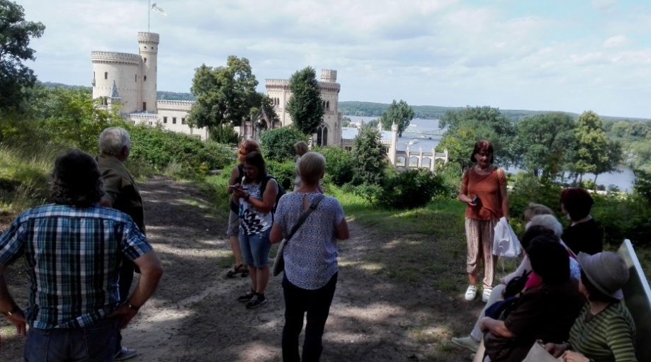Słoneczny poniedziałek, najprzyjemniej spędza sie taki dodatkowo wolny dzień w zieleni. Nic zatem dziwnego, ze 21 maja tj. w Zielone Świątki, wzięło udział w naszym otwartym dla wszystkich chętnych spacerze, aż 45 osób. Spotkaliśmy się na Wannsee, mimo tak dużej grupy wszyscy zmieścili się to autobusu który podwiózł nas pod samą przeprawę promową na Pfaueninsel – Pawią Wyspę. Wiele osób mimo, że mieszka w Berlinie od lat, nigdy tu nie było. Jak sama nazwa wskazuje, trwająca zaledwie parę minut przeprawa promem zabrała nas na prawdziwą wyspę, po oderwaniu od stałego lądu wszyscy poczuliśmy sie naprawdę jak na małym urlopie. Nasza prezes, kol. Ela która zorganizowała i poprowadziła ten spacer, zaczeła snuś historię tego miejsca, bardzo wszystko ciekawe, ale nasze oczy wciąż zajęte były polowaniem na pawie.. . szczególnie tę jedną parę, pawich albinosów. Niestety dla zobaczenia tych białych koronek na pawim ogonie będzie trzeba przybyć tu jeszcze raz. Nie szkodzi, przyjedziemy chętnie.